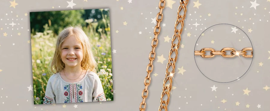 Щоб обрати ланцюжок, слід звернути увагу на деталі. Ланки мають бути правильно з’єднані залежно від плетіння, без гострих країв, які можуть чіплятися за одяг та волосся. В Києві неважко відшукати вироби ручної роботи і завдяки можливостям інтернет-зв’язку придбати з будь-якого куточку країни. Золото саме по собі має мінімальний шанс розвитку алергії, тож стане у нагоді діткам з чутливою шкірою. Вага прикраси часто не досягає двох грамів, що робить її майже невідчутною. Довжина стартує від 35 см, і залежно від віку ланцюжки для дітей із золота підбираються з розрахунку подвійного обхвату шиї. Певний запас потрібен для зручності та дозволить за бажанням приховати виріб під одягом. Додаткові матеріали – сучасна відповідь класичним традиціям. Іноді саме вони гарантують зацікавлення з боку дуже вимогливих поціновувачів і супроводжують дітей на шляху у світ краси: